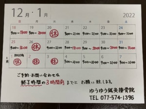 2022年12月18日(日)~2023年1月7日(土)の施術時間