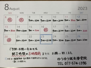 2023年8月6日(日)~2023年8月26日(土)の施術時間