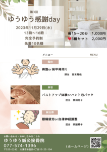 11月28日(火)・29日(水)・30日(木)・12月7日(木)は柔道整復師の腰痛ライダー(宮木隆佑)の施術も行います。二人体制ですので、二人同時に施術可能です。お友達やご夫婦、親子などで一緒に身体の調整をされるのもオススメです。